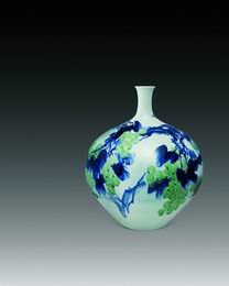 | 备 注: | 作品赏析 以综合装饰的技法绘製花果等题材对於曾维开而言已经是极为成熟的技术了。在这些作品中,青花往往用来表现枝干、叶片,而其他色釉则用来表现花朵、果实,起到画龙点睛的效果。此件“硕果图”瓶枝叶用笔老辣恣肆,叶片灵动,似有飘逸之感。果实颗颗珠莹,饱满圆润,似有摇摇欲坠之势。作品以精湛的画工表现出了葡萄园一派丰收的喜悦景象,同时也隐喻着“硕果丰盈,丰收年年”的美好寄托。 作者简介 曾维开(B.1941),广东兴宁人。系中国工艺美术学会高级会员、江西省高级工艺美术师评委、景德镇市陶瓷研究所副所长。擅长人物瓷雕、半刀泥刻花和青花、色釉装饰。 | ||