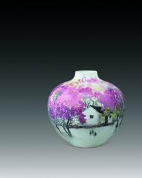 | 备 注: | 作品赏析 此件“乡村金秋图”瓶,器形如珍珠,饱满圆润,华丽高贵,运用“釉上珍珠彩”技法,令色泽晶泽高亮,玲珑剔透。“金风送爽,红枫映晚,青山疏影,黑瓦白墙。”江南水乡的自然美景尽收眼底。赖德全的“釉上珍珠彩”充分挖掘出了材质之审美潜能,利用彩料直接渗透至釉层的原理,大大减弱了色泽与图案的在烧造气氛中的波动,达到了“借料生情”的艺术效果。整件作品瑰丽夺目,画面有尽,意韵无穷。 作者简介 赖德全(B.1955),江西赣州人,生於景德镇。现为江西省陶瓷研究所高级工艺美术师、中国工艺美术大师、中国工艺美术学会高级会员。擅於粉彩与新彩。 | ||