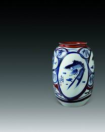 民窑瓷器最大的特点就在於率性为之,随意自然,但求天趣。这件青花釉里红观赏瓶从古代民窑瓷器中得到灵感,以简笔鲤鱼入画,深得其中三味。包括民窑特有的颜色深重的青花,发色深沉的釉里红,流畅迅疾的用笔,无一不在阐述着作者想要表达的艺术语言。器身书吉祥、富贵、有余等民间的吉利用语,烘托出整器的气氛。