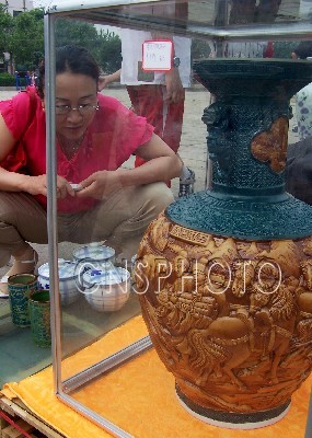 中国新闻网:2006年6月3日,山东省平阴县老广场景德镇瓷器展销会,标价:18万元天价的一高仿三顾茅芦瓷器. 这些作品在行业不入流,却能在各地爆出天价卫星,不知道这些商人良心还有没有? |