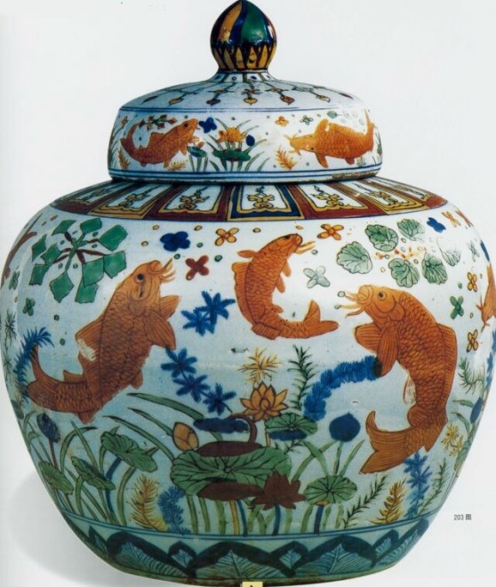 高33.9厘米, 口径19.6厘米。明代景德镇御器厂制品,上海博物馆收藏。五彩鱼藻纹图在明代嘉靖时常见,尤以罐为多。此罐矾红画鲤鱼,肩部饰复莲,下腹绘蕉叶,其鱼藻错落有致,疏密蕴韵,藻随鱼动,鱼回水势,颇见匠心,为典型的嘉靖五彩瓷。