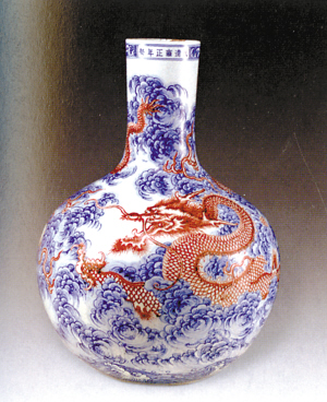 瓷器釉下彩名。用铜红釉在坯胎上描绘纹饰,然后施透明釉,在高温中一次烧成。创烧于唐代长沙窑。元代景德镇挖掘并成熟发展,并盛行于元明清。纯装饰形式有线描、拔白和涂绘。宣德窑釉里红三鱼高足杯最负盛名。康熙窑有釉里红、青花和豆青釉的釉下三彩,有釉里红配釉上绿的“红花绿叶”彩。雍正窑釉里红最为成功,其发色之艳丽,器物之大型,甚为罕见。
