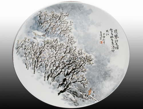 访友图多属清未民初的青花、浅绛彩和粉彩画面,绘春景或秋景山水,丛岭迭障,山涧飞练,古松如亭或桷枫飘丹,隐现茅舍草屋。,山道上有老者策杖,侍童抱琴向隅而来。画图,山水为宗,人物如芥。诗题:雨后流泉响清韵,携琴访友山径行,茅斋尚有谈禅约,琴鹤同清亦知音。 |