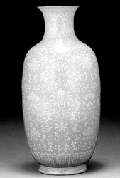 清乾隆·豆青釉堆白莲纹灯笼瓶,高55.5厘米。瓶身通体施豆青釉,再以白粉绘缠枝莲纹、如意纹、蝙蝠等各种精细纹饰,青地白花,淡雅悦目。 在清釉上以白粉堆凸花纹的装饰风格盛于乾隆早期,有如此尺寸及华丽釉色的瓷器非常罕见,极其难能可贵。与此件类似的见有北京故宫博物院藏的绿地白彩瓷瓶,器型略异,尺寸亦小于此件,但器底所署的是嘉庆年款。同样品种较为常见的是墩式碗,故宫博物院和南京博物院均有所藏。 在青釉上以白粉堆凸花纹的装饰风格始自清早期,可能是来源于泥绘的技巧,盛于唐英主持景德镇窑务的乾隆朝早期,与印、刻花及青花加白一起作为各色青釉的重要装饰手法,经久不衰。白彩直接施于釉上,更见透薄莹润的感觉。 杨羽