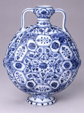 青花花卉锦纹双耳扁瓶,明永乐,高24.3cm,口径3.5cm,足径7.4cm。