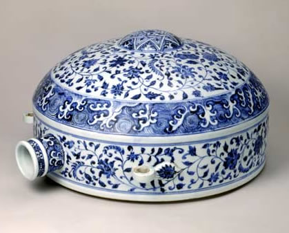 青花缠枝花纹扁壶 青花缠枝花纹扁壶,通高54cm,口径6.5cm。 壶小口,两环耳,器身圆形如龟状。壶背面素胎,中心凹入一圈。壶正面隆起。釉色青白光洁,青花浓翠,深入胎骨,有铁锈斑点。正面中心隆起部绘八角锦纹,以海水江崖为地,中心四周为缠枝莲,外环以海水江崖。壶颈凸起弦纹一道,上下绘缠枝花及海水江崖一周。壶盖圆顶。盖面绘四株折枝花,叶蔓清秀,运笔流畅,花大而叶小,叶纹为纤细齿状。 此壶纹饰精美,式样别致,是当时受西亚金属器皿的影响而烧制的新器型。 (撰稿人:董健丽) |