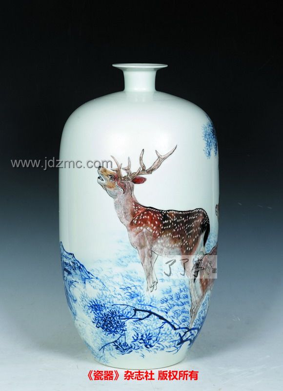 釉上彩瓷瓶《古柏双鹿》作者:黄翔 高:50cm口径:9.5cm 《古柏双鹿》作者:黄翔 黄翔,高级工艺美术师,毕业于景德镇陶瓷学院。其作品笔触细腻、隽秀,形神毕肖,生动逼真,充满大自然的盎然情趣。