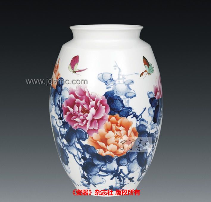 釉上彩瓷瓶《富贵牡丹》 作者:徐炜 高:40cm口径:7.8cm 《富贵牡丹》作者:徐炜 徐炜,1976年生于景德镇,青年陶瓷艺术家,作品多为釉下青花结合釉上花鸟为题材。其作品奔放中不失细腻,既有现代的装饰感,又不失传统的诗情画意。