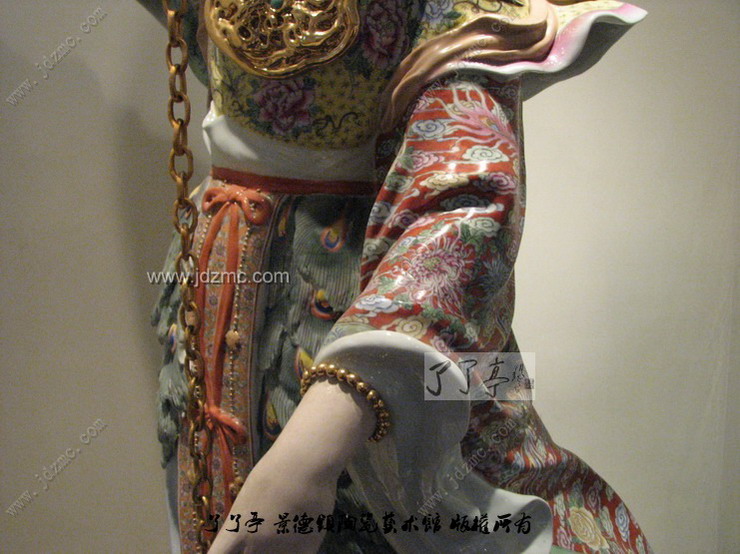 曾山东的粉彩彩绘降龙仕女是一个接近一人高的瓷雕作品,创作具体年限不详,仕女人物色彩富丽堂皇,金光闪闪,色彩的运用配色十分老道,人物造型肥润双眼柔嫩自带威严,整体造型比例协调,设色雕琢工艺如神来之笔,为曾山东精品名作中不可多得的一件代表作,名不虚传的技艺再现中华制瓷工艺的博大精深。