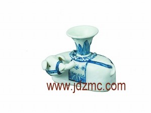 这件清乾隆青花太平有象尊,1986年出土于北京市海淀区板井村,现藏于北京市海淀区博物馆。通高11.2厘米,宽11厘米,长13厘米。尊为象驮宝瓶造型,象呈卧姿,回首张望,长鼻高扬,尾巴贴身上翘,背部鞍座上驮有宝瓶一只,瓶身呈上大下小的喇叭状。器物底部露胎,胎质洁白,坚硬致密,瓷化程度非常高。除器底外,器身满施透明釉,釉色白中泛青,纯净晶莹。器物充分利用了釉下装饰手法,于施釉前先在胎体上刻画出深浅、长短、方向不一的凹槽,施釉后,凹槽处积釉较厚,略呈淡绿色,形象地表现出象身上的血脉、经络、骨骼的质感,使象的造型更加栩栩如生。同时,釉下青花装饰也得到了很好的运用,在洁白的胎体上用青花绘制缰绳、鞍座、披搭及宝瓶上的蕉叶纹,简练大方、雅俗相宜。对眼睛的处理更是别具一格,先是在眼睛部位刮去已上好的釉层,露出圆形胎地,在胎地上用黑釉点出一个略小的同心圆,使眼睛的黑白比例更加适宜,色彩对比更加强烈,动物神态更加自然可爱,颇有“画象点睛”的韵味。可爱的造型,精巧的装饰,不愧为一件既有生活情趣、又具艺术美感的瓷塑陈设品。
