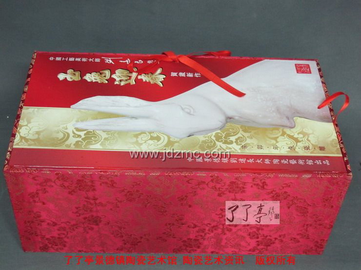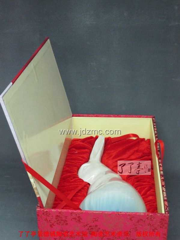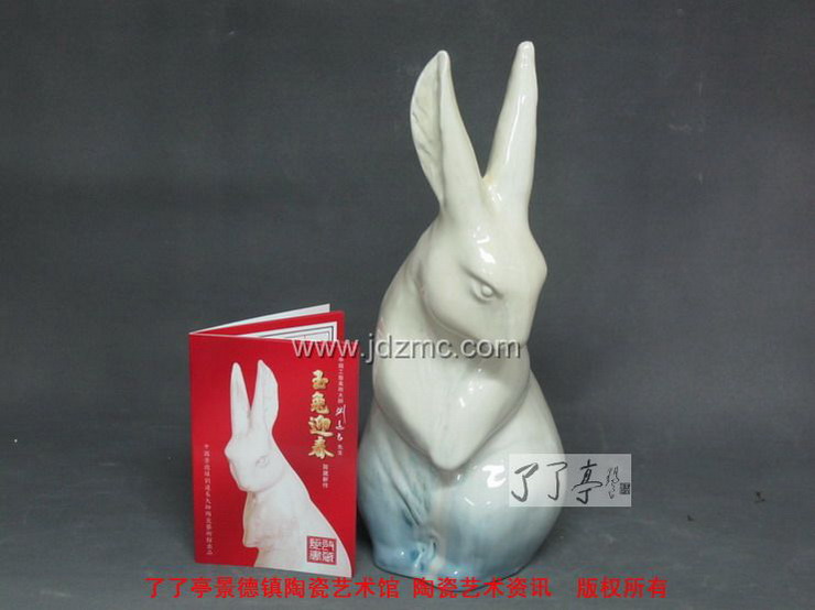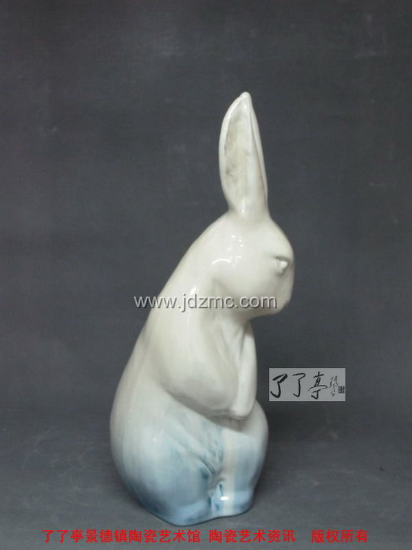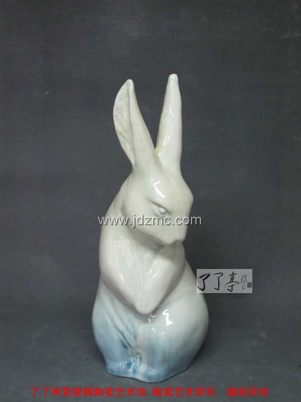 刘远长这只限量1000号兔年生肖陶瓷《玉兔迎春》终于和大家见面了,在色釉的选择上面,刘远长大师拿出了当年经典之作“领头羊”相同的色釉,只是在瓷兔的底部加上了一圈蓝色花釉装饰,这两种色釉都是强流动的高温色釉,也正是这种强烈流动的效果,给予了雕塑动感和皮毛的质感,同时也因为是强烈流动的高温色釉,“玉兔迎春”的底部在烧制的时候是有底托的,在窑火中,高温流动的颜色釉淌过底足,最后进行旋切,这和郎红的烧制方法是一致的,我们可在雕塑的底部看到旋切纹。