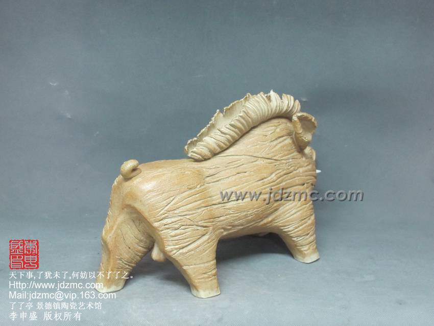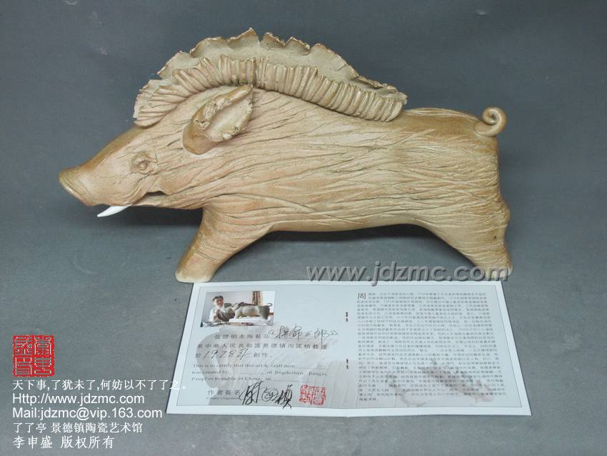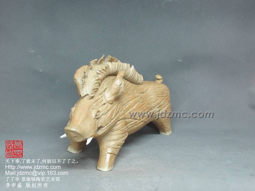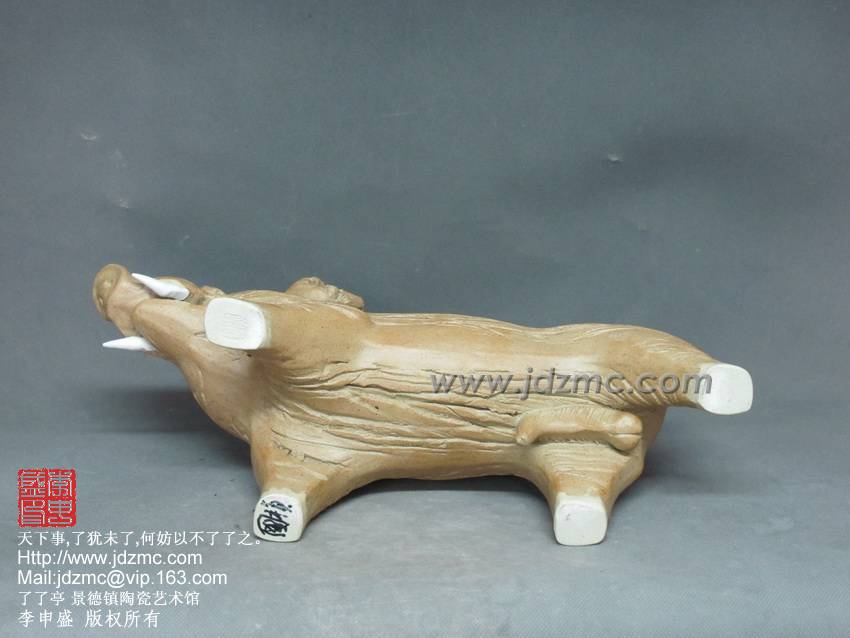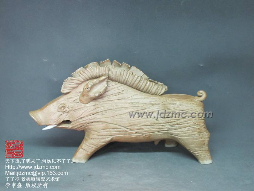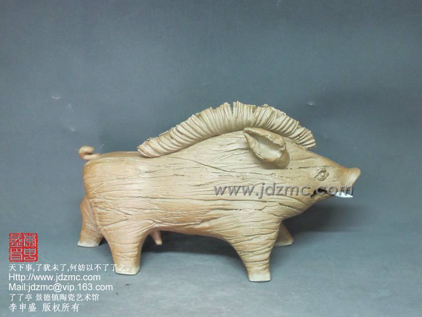 周国桢的作品,充满了浪漫的画意,而风趣的标题,更添了作品的情趣。 “拼命三郎”的野猪,采用的是陶瓷媒介--粗质陶瓷材料,不同程度地淡化了人工雕凿,强化了主观意识、材料出身表现力和泥土的运动,从 “拼”字上着眼,有意将颈、背部凸起,颈毛如峰,龇牙挺首,显示健美体感和强烈的冲动势头。富有阳刚之美,使“形象和情趣的契合”走入了高级阶段。 了了亭 李申盛/文