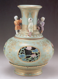 粉青釉描金镂空开光粉彩荷莲童子转心瓶 |