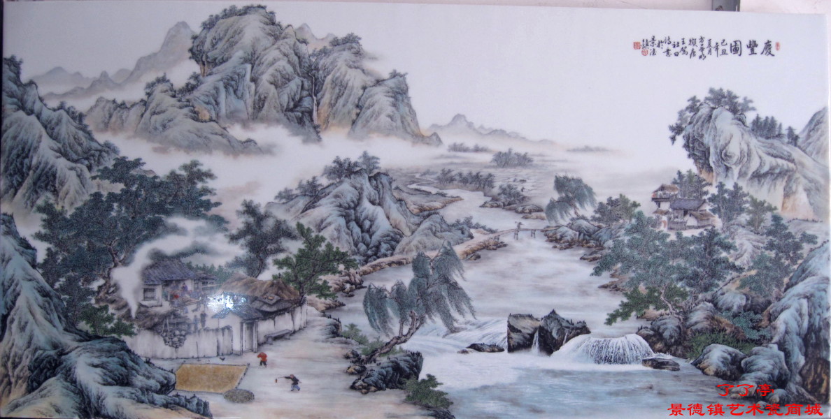 规格:三尺六寸.115x56cm,. 方华明幼时就喜爱艺术,八十年代开始师从程元漳学习陶瓷彩绘,师承了程元漳优美精细的画风.这幅山水作品,画作清新雅致,有浪漫磅礴之气。颇耐近看远赏,观之如入仙境超然脱俗,山里人家,群山峻林,无论巨细.均表演得淋漓尽致.我把此作挂在我景德镇门点进门处,凡进入店者,都会满有兴趣地观赏一阵,然后发出共同的感概"真细呀!不容易呀.好作品."此作颇费功夫,画中的工笔人物是慢功出细活,它宛若是女士手中的女红,纤针细线,微孔密眼,又如力士手中的刀斧,左右开弓,几经打磨,刻画出山峻岭美. 我见方华明作画.是深有触动的.今年夏秋,景德镇很是炎热.方老师那儿没装空调,身旁一把电扇.常是赤膊上阵.一手拿着放大镜,一手拿一支细笔,画瓷扳上小人儿,聚精会神,我为之感动。有诗曰"谁知盘中餐,粒粒皆辛苦"其实,谁又知每一幅值得称道的艺术品,包含着多少付出,多少积累,多少成败,多少心血。 这几年来方华明的作品年年有进步.这是我的朋友们公认的,他们关注着这有强烈的传统元素的重工工笔作品,很多后出道的艺术家追求写意,追求快速,追求谁也说不清的陶艺去了。有多少人愿意苦苦地留守这块繁重的艺术领地呢,方华明执着地守望着,辛勤地耕耘着。天道酬勤.方华明很放松,从容相对,自有他自已的乐和趣。了了亭.陈也君/文 |