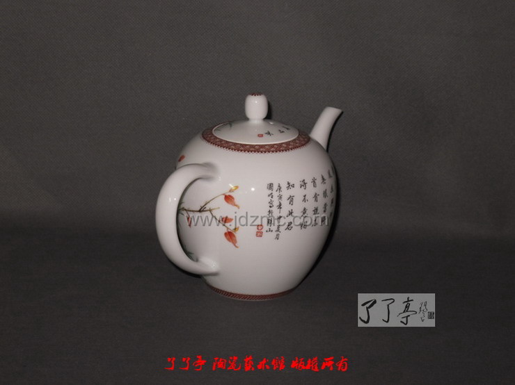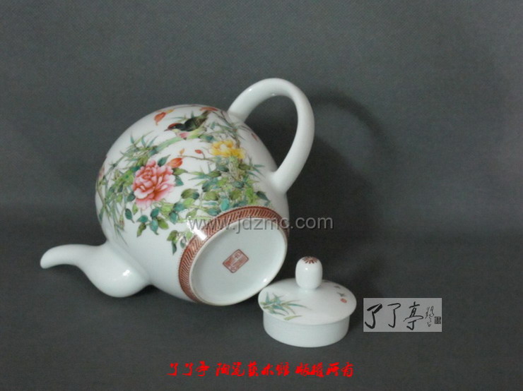这件茶壶,拿到手的第一反应就是胎质非常好,莹润而且壶型不错。因而,徐国明老师在这件茶壶上是花费了不少功夫。茶壶体积颇大,所以在底部和茶壶盖上均有所图案装饰,这一圈图案装饰不但没有对画面进行圈定,反而加强了花卉布局的观赏性和富贵性。就画面而言,徐国明老师的笔下,无论是竹子还是月季和枫叶,繁而不乱,绘制的都是那样自由自在,放松闲散,疏落自然。这四季常青,青春洋溢的花卉加上两只相互呼应的工笔小鸟,好似世外桃源,又象是心灵的散步,毫无牵强与刻意。不知道您注意过没有,那一只过墙到茶壶另外一面的枝叶,将徐国明老师缜密的创作风格得以淋漓尽致的体现。徐国明老师在动笔之前,已经在胸中将题材酝酿了多时,并且在长期的创作过程中,把各种先前的画面反复体裁、筹思构图,充分的考虑了茶壶的画面构造,加上对自然现象的观察,这数枝过墙的枝叶,在徐国明老师的各种茶壶花卉题材中均有体现。这正是,邻面花满园,时复过墙来。一片青绿色,居是为我栽。精神宽松的创作环境是从心灵到画面的充分映现。了了亭·李申盛/文