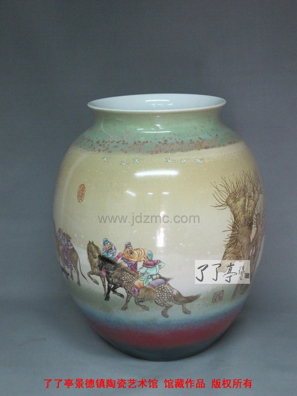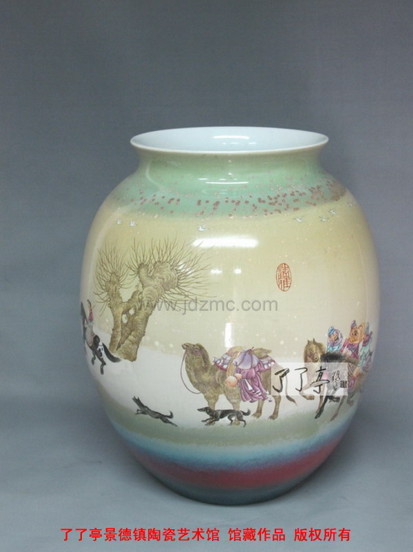 ![]() ![]() ![]() ![]() ![]() ![]() 这件《长安出行图》瓷瓶,今天我拿着放大镜放大好多次,细看,瓷绘术语就不多提,大家对李文跃老师熟悉程度绝对比我懂得这点皮毛多得多,他将粉彩瓷的粉润柔和之秀美与墨彩瓷的清丽雅致之意韵融为一体,创立了颇具个性的“粉墨彩瓷”之先河,有文人画作之灵气,无工匠艺品之匠气,真情内蕴,古朴造化。个中技法、工笔、意境……,只是让观者记住了李文跃这个“昭君出塞在长安”的女性意境和悲壮的历史定格。“和番”是咱们祖宗发明的“和为贵”的惯例,从“文成公主”到李文跃的这幅“长安出行图”,大致刻画了我华夏民族的宽宏大度的民族气节。 《长安出行图》将高温釉彩产生的色釉肌理效果,于块面上幻化成雾霭,形成妙趣横生的空间体积变化和气势宏阔的空间感,继而以粉彩装饰状写主题画面,强化物象的具体细详与非控制之间的“窑变艺术”,你看——马队的焦灼、烈日中的胡杨、漫天的黄沙、浩荡的队伍、繁华的华夏象征……淋漓尽致于瓷瓶之上,回味…… 历史的、艺术的、点睛的……回味。不知道,作为观者的您,还要作品能承载什么?是承载李文跃不随波逐流以及给历史最美得诠释,还是烈日当头,风沙呼啸即将入胡和番的美女在马铃的催促之下峨眉微皱、去意已决、不舍故土的真情。这一切跃然于李文跃笔下,于一丝一发,马队远行的顾盼……将历史瞬间无奈的背影遗落在沙丘之上…… 草在土中生,一位评论家也应该如艺术家一样须根植于景德镇这片沃土才是正统,我的眼界根植于这个历史渊博的小镇,我思我想,创作出这样的作品,能让俗人看出真与美的作品……他应该的啊,有句话叫责任,那是他作为教授,作为大师的义务……了了亭·李申盛/文 |