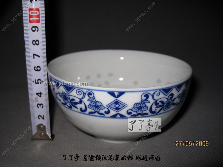 同时,青花玲珑加彩更让瓷苑添奇葩。青花玲珑加彩,又称玲珑斗彩,是一种青花玲珑装饰与釉上装饰相结合的传统装饰形式。它是用新彩颜料,在米粒状玲珑眼上画瓜子状,在圆点状玲珑周围描饰太阳光线,或画英子、双钩、寿字等图案花纹,在青花的花纹上描绘金线,加彩以后经镶金,再进烤花窑烘烤而成的。青花玲珑陈设瓷加彩的方式多样,范围更广泛,装饰更精细。它除了与新彩装饰结合外,还与古彩、粉彩、腐蚀金彩、色釉等装饰结合在一起,装饰题材与内容十分丰富,有人物、花鸟、山水、图案等。罗汉汤碗是青花玲珑中典型的、经久不衰的畅销品种。在构图上它是以玲珑装饰在碗壁的中间部位,米粒状的孔眼均匀排成几何形的菊花图案。青花装饰色彩较为清丽、明朗。青花(十字边、芭蕉脚)都是二方连续图案,排列紧凑,与玲珑眼组成的图案疏密对比。碗内边缘饰青花(工字、蝙蝠)和底部的(龙心),通过寓意和象征的手法,表达高贵、吉祥的愿望。整个画面主次分明,层次清晰,运用了虚实、疏密、参差、纵横等对比手法,既有秩序条理,又有起伏变化,从而形成简练、明快而又丰富的装饰风格。