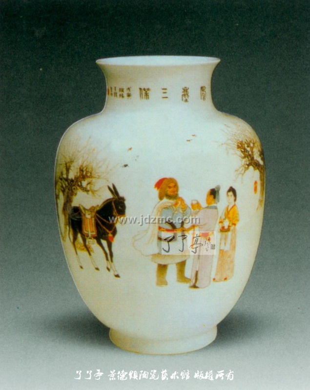 风尘三侠(粉彩瓶) 这是以隋朝末年李靖、虬髯公、红拂女辅佐唐王的历史故事为题材的作品。虬髯公钦佩李靖治国之才,赠送大批粮草钱财给李靖以帮助李世民打天下。这里表现的是他们告别时的情景。作品布局得体,人物神情动态刻画很有分寸,画面与瓷瓶的造型有机地结合在一起,耐人品味。作品描绘三侠“处江湖之远而心怀庙堂之高”的侠骨柔肠,也是作者的自我心境写照。