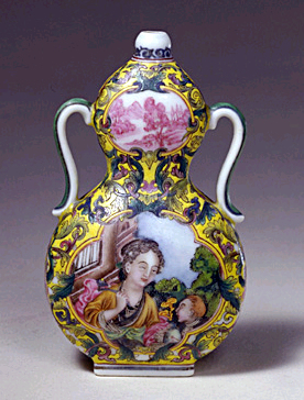 此瓶纹样描绘细腻,尤其是开光内的西洋女子衣着华丽,因采用了西洋画的明暗透视技法而具有立体效果。葫芦形的瓶体和山水图案则体现了中国传统的文化意味。东西文化的交融在这件器物上达到了和谐的统一。