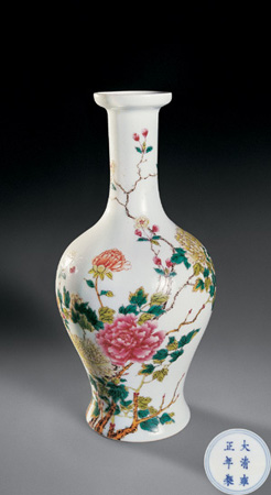 粉彩是在五彩基础上,受珐琅彩工艺影响,由景德镇御窑厂独创的一种釉上装饰彩瓷。其所用的颜色比五彩丰富,绘画风格也逐渐趋向工致、秀丽,颜色浓淡协调,具有纸面绘画般的艺术效果。上图中标志粉彩瓷达到成熟地步的雍正珊瑚红地粉彩牡丹纹瓶,用线与五彩雄健刚劲的风格截然不同,其花、其《的勾勒匀细纤巧,形象显得十分秀美。粉彩的填色由平涂改用有光暗变化的洗染,具有了鲜活的色阶变化。姿色各异的牡丹能分染出不同明度,具有浓淡、深浅迥同的色调,增添了无限的典雅雍容的气质。更由于粉彩的铅粉打底,玻白的乳化作用,使整个器物完美地表现了“前无古人,后无来者,鲜娇夺目,工致特常”的艺术魅力。加上以珊瑚红为地,与常见的白地相比,别具风韵。红色的衬地无疑对色彩对比上更具有娇艳的美感,可谓弥足珍贵。