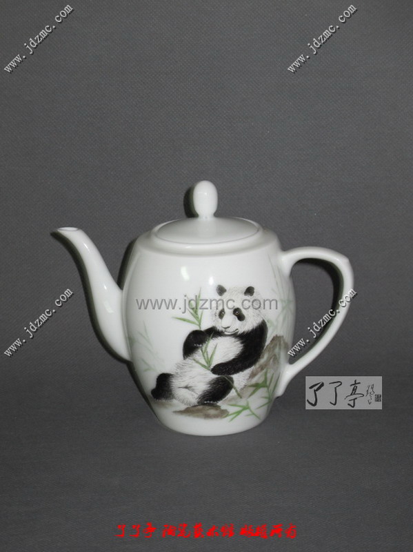 他的笔下,动物与人一样,有着各自的秉性和内心情感,画动物就应该拟人化,人只是一种高级动物,在百兽之中,每一个物种都有他的七情六欲,有安详,有凶猛,有诙谐,有柔情,而这也正是艺术家自己的心情表现。而我看来,吴锦华这一系列小动物作品,有别于他笔下老虎的凶悍,更多地表现小动物的柔情与诙谐一面,他在茶壶的方寸之中将这些小动物的胸、腹、腰、尾等部位“活”起来,比如那只画熊猫的茶壶最成功之处还在眼睛,熊猫眼睛不但极其精准,而且画出一种深沉与专注的神情,一笔点睛,画出了熊猫的神韵,活灵活现、憨态可掬。虽然瓷画上熊猫不能如其它走兽设色鲜亮,花纹美丽,但是这黑白二色,加上浑圆的身材,又厚又有质感的皮毛,一一清晰分明,层次可辨,无论远观把玩皆无可挑剔。了了亭·李申盛/文
