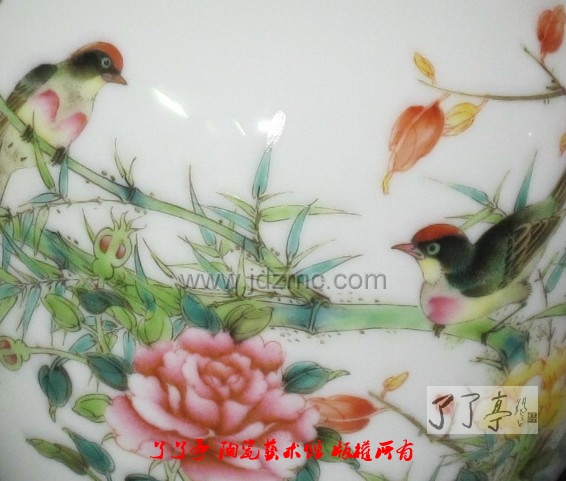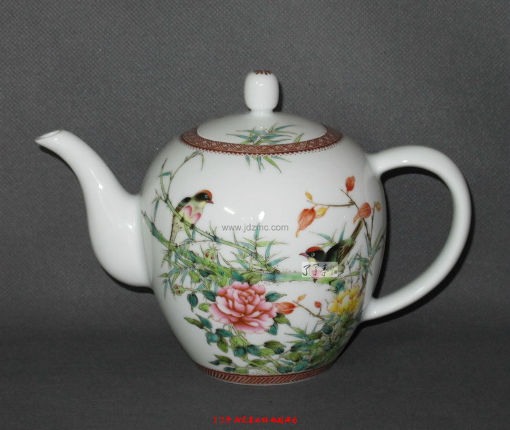 这件茶壶,拿到手的第一反应就是胎质非常好,莹润而且壶型不错。因而,徐国明老师在这件茶壶上是花费了不少功夫。茶壶体积颇大,所以在底部和茶壶盖上均有所图案装饰,这一圈图案装饰不但没有对画面进行圈定,反而加强了花卉布局的观赏性和富贵性。就画面而言,徐国明老师的笔下,无论是竹子还是月季和枫叶,繁而不乱,绘制的都是那样自由自在,放松闲散,疏落自然。这四季常青,青春洋溢的花卉加上两只相互呼应的工笔小鸟,好似世外桃源,又象是心灵的散步,毫无牵强与刻意。不知道您注意过没有,那一只过墙到茶壶另外一面的枝叶,将徐国明老师缜密的创作风格得以淋漓尽致的体现。徐国明老师在动笔之前,已经在胸中将题材酝酿了多时,并且在长期的创作过程中,把各种先前的画面反复体裁、筹思构图,充分的考虑了茶壶的画面构造,加上对自然现象的观察,这数枝过墙的枝叶,在徐国明老师的各种茶壶花卉题材中均有体现。这正是,邻面花满园,时复过墙来。一片青绿色,居是为我栽。精神宽松的创作环境是从心灵到画面的充分映现。了了亭·李申盛/文