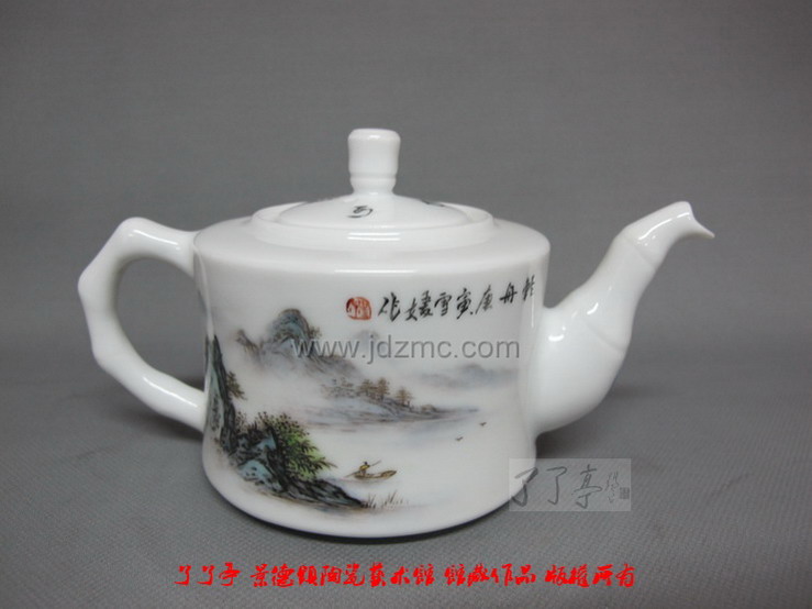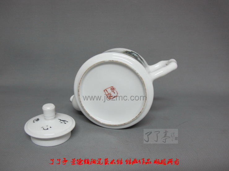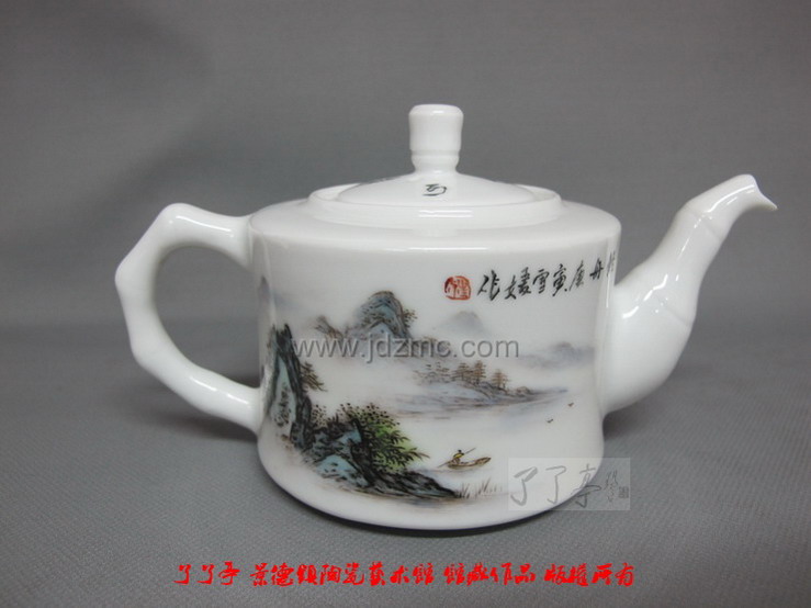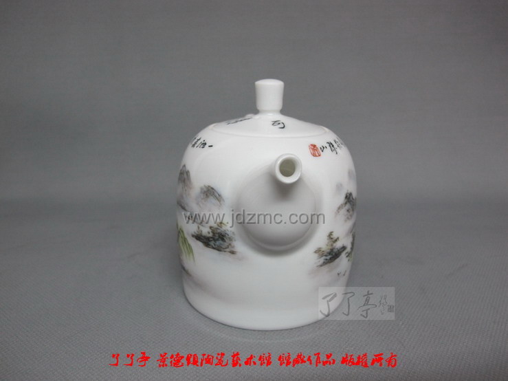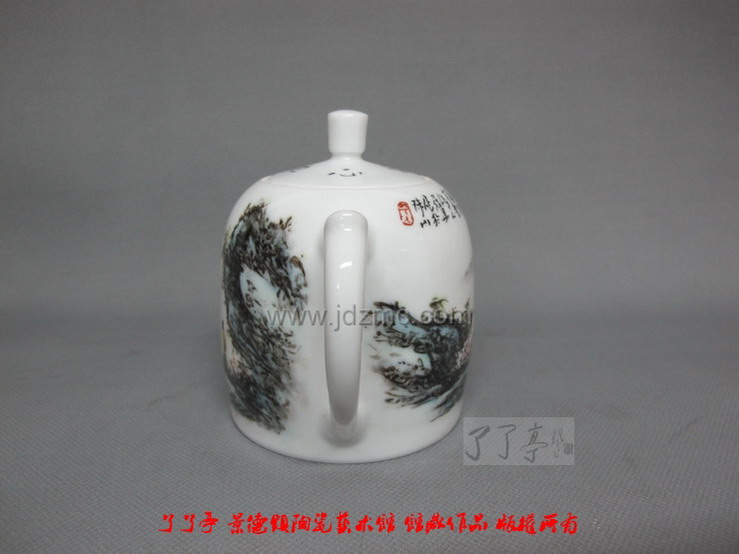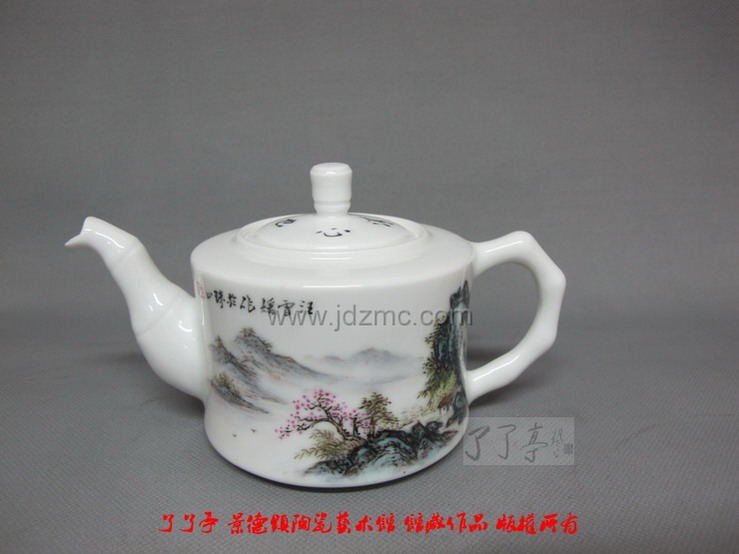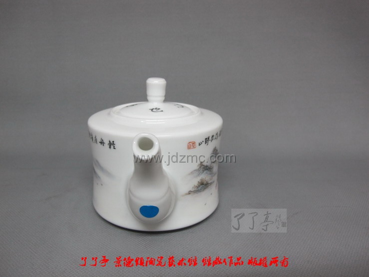 在景德镇陶瓷粉彩山水画的历史延续中,无论是叙说青绿山水画的骄人历史,还是陈述青绿山水画的脉络承接,汪野亭世家的画风与影响只是想告诉人们,当今盛世是粉彩青绿山水画这一陶瓷流派的艺术魂宝再现光华的好时期。在江南景德镇这座风光优美的小城附近皆是著名的旅游景点,车行其间,沿途烂漫山花,绮丽林木,深涧幽谷,绝壁危岩,山区景色一一从眼前掠过,这些都成为了景德镇陶瓷山水画艺术家们取之不尽用之不竭的创作素材,比如视频中这两件通景的山水小茶壶,不仅表现了江葆华和汪雪媛对待作品的认真负责,更为浓缩了江南山区的无限风光。画中山的凝重与云的轻柔,交织着春景绚丽的动感。雄奇险峻的绿色丛山,构成近景画面的主体;远景逶迤连绵的山峦与水泊作为主体画面的延续,这青绿为主的粉彩色调,酌以点缀在山林掩映下的古老茅屋,分层次地表现山景的丹翠灿然与浓郁春韵的回响,可以看成是江葆华和汪雪媛粉彩青绿山水的上佳作品。了了亭·李申盛/文