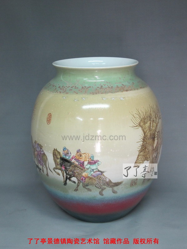 《长安出行图》将高温釉彩产生的色釉肌理效果,于块面上幻化成雾霭,形成妙趣横生的空间体积变化和气势宏阔的空间感,继而以粉彩装饰状写主题画面,强化物象的具体细详与非控制之间的“窑变艺术”,你看——马队的焦灼、烈日中的胡杨、漫天的黄沙、浩荡的队伍、繁华的华夏象征……淋漓尽致于瓷瓶之上,回味…… 历史的、艺术的、点睛的……回味。不知道,作为观者的您,还要作品能承载什么?是承载李文跃不随波逐流以及给历史最美得诠释,还是烈日当头,风沙呼啸即将入胡和番的美女在马铃的催促之下峨眉微皱、去意已决、不舍故土的真情。这一切跃然于李文跃笔下,于一丝一发,马队远行的顾盼……将历史瞬间无奈的背影遗落在沙丘之上……