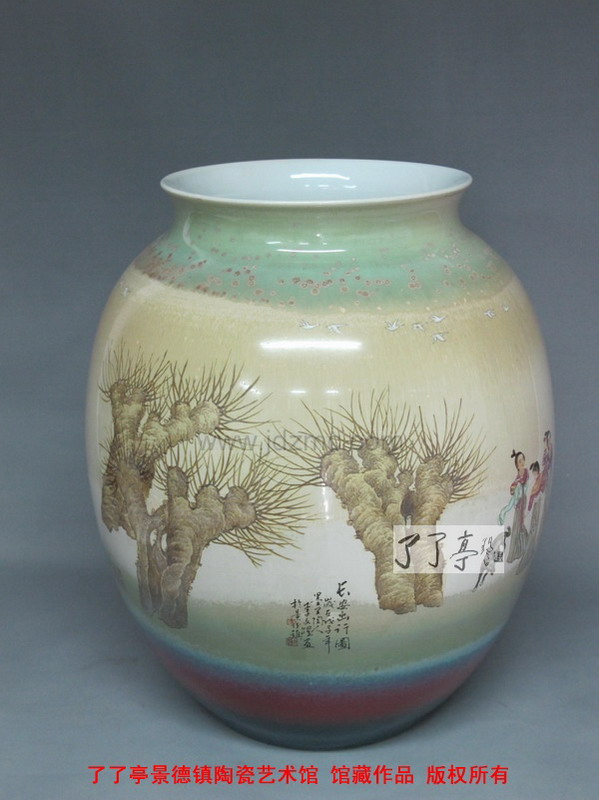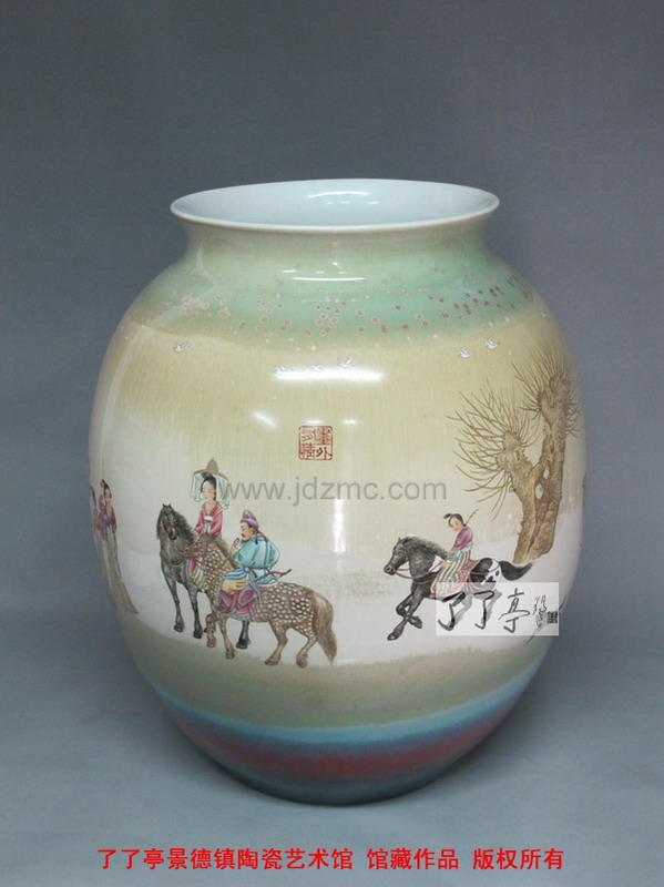 这件《长安出行图》瓷瓶,今天我拿着放大镜放大好多次,细看,瓷绘术语就不多提,大家对李文跃老师熟悉程度绝对比我懂得这点皮毛多得多,他将粉彩瓷的粉润柔和之秀美与墨彩瓷的清丽雅致之意韵融为一体,创立了颇具个性的“粉墨彩瓷”之先河,有文人画作之灵气,无工匠艺品之匠气,真情内蕴,古朴造化。个中技法、工笔、意境……,只是让观者记住了李文跃这个“昭君出塞在长安”的女性意境和悲壮的历史定格。“和番”是咱们祖宗发明的“和为贵”的惯例,从“文成公主”到李文跃的这幅“长安出行图”,大致刻画了我华夏民族的宽宏大度的民族气节。
