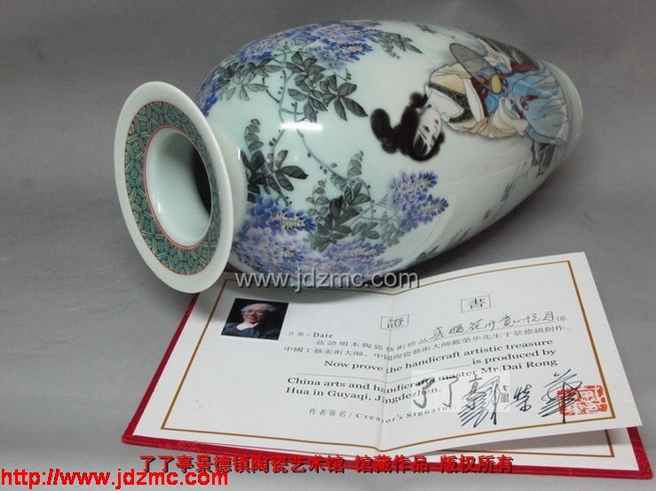 我曾与一个外地来的画家讨论景德镇当代瓷画,看得见此位老兄一脸的不屑。我不作声.拿出一个戴荣华的粉彩作品让他仔细看看,他眼光一落在这瓷瓶上,脸色立即改变,然后很专注地欣赏起来。