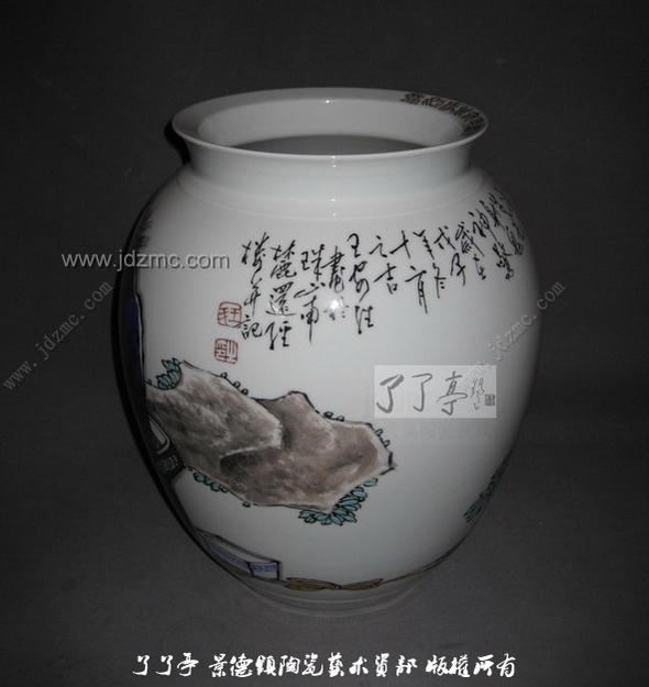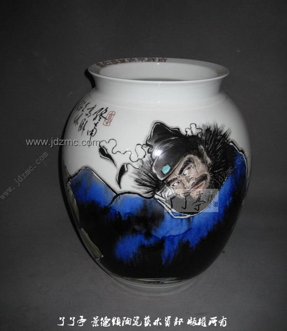推荐一件作品,就必研究作者。而研究一位画家,也一定要从了解这位画家开始。今天上四件作品于商城,不打算写什么,而是把作者前不久出版的一本专著"王安维瓷艺文选"中地自己写的序全录于下,让大家去了解他:还加上王锡良的一段介绍. 我有幸出生在景德镇这个举世闻名的瓷都,更有幸出生在四代业陶的陶瓷世家。曾祖父王昌彬(文宜)先生是清代光绪、宣统的御窑官,祖父王庭芳(旺柏)早年就读于江西窑业学校,后就读于上海美专,父亲王隆夫(昌南子).则是中国工艺美术大师。因此我从孩提时代就受家庭环境的感染,对拉坯成型、施釉窑烧、绘瓷填色以及炉彩等等了如指掌,不仅观察而且也动手做一些泥塑或在瓷胎上画上几笔,我父亲是坚决反对我过早从事艺术创作,不允许我动他的笔和颜料,在他看来如果从小就业陶,将来必然就成为瓷业的工匠而已,他要求我多读书,多做学问,等大学毕业后再从事陶瓷艺术创作活动。在如今看来,他的想法确实是有道理的,因为画瓷器只不过是掌握其工艺性能,掌握料性、窑炉燃烧性能,性能有一年甚至几个月的时间就能掌握,而真正的艺术家画一件作品主要是画修养、画文学功底,这样的作品放在人们面前就区别于一般工匠绘画了,她能耐人寻味,富有诗感。 我小时候家里非常穷,买不起《新华字典》之类的工具书,有什么不懂的字和词就问祖父王庭芳,他是个很有学问的人,在我看来没有他不认识的字、没有他不懂的词,尤其是他的小楷写得非常工整漂亮。记得他常常在煤油灯下用一个很小的放大镜看范文澜的《中国通史》,然后讲给我听,所以我今天画的很多历史题材的作品都是他讲给我听完后凭我的想像创作出来的。如今祖父曾经有很多机会留在国外、留在沿海城市,但因为我是陶瓷世家的后代,也是王氏陶瓷世家的唯一男孩,我有责任把祖辈的艺术像比赛场上的接力棒一样接过来,并发扬光大。所以我每创作一件作品,每想到陶瓷艺术存在的问题时,我都会用心把它记下来,撰写心得体会。今天我向读者呈上的?《王安维瓷艺文选》是近十年来从我的讲稿和论文里挑选出来的,这些文章大多先后在国内外报刊杂志上公开发表过的,也有些是我在上海刘海粟美术馆报告厅作的专题演讲的录音整理出来的,有些是我在新加坡“东方收藏”组织的讲课中整理的,这里有很多不成熟甚至是错误的地方,我衷心希望,本书出版后,能得到学术界同行和广大读者的宝贵意见。2005年12月.王安维. 王安维集书法与绘画于一身,都达到高境界.景德镇标志性的场所"昌江广场"四个大字,就出于他手, 王安维先生曾是大型陶瓷壁画《洛神赋》(现安装在香港“中国文物展览馆”)以及<碧血>(现安装在上海龙华烈士烈士陵园),的主要设计者和绘制者. 他的专集"王安维陶瓷书画作品集"上,王锡良(第一届中国工艺美术大师)为他作的序中,称他为:青年才俊王安维.今天,我就把王锡良大师在序中的第一段抄出来作为对王安维作品的介绍:"前几天看到王安维新近创作的陶瓷作品,我感触最深的是他的意笔人物装饰,他运用景德镇独有的陶瓷肌理,材质,淋漓尽致地勾画人物的衣衫或背景,或黑里泛兰,或粗犷与细腻纹饰的对比,或线条与大块色彩的对比,虽然他也画画动物,花鸟,山水之类的作品,但他的意笔人物充满了诗意和书卷气,其作品最好地表现了他本人自身的绘画功底,艺术理想和精神境界." 本作品就是王锡良大师称之为"意笔人物装饰".王安维的特色作品.了了亭.陈也君/文摘