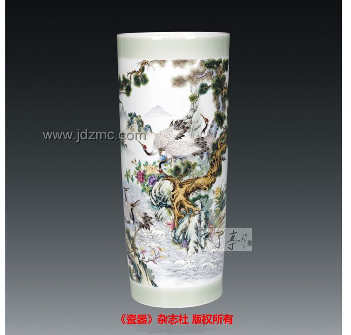 釉上彩《松鹤延年》 作者:陈国珍 高:54cm口径:23cm 《松鹤延年》作者:陈国珍 陈国珍,青年陶瓷艺术家,擅长陶瓷人物、花鸟、图案装饰设计。其作品形象生动传神,格调高雅脱俗。