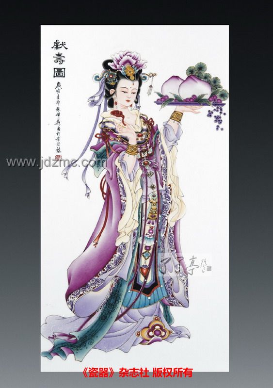 釉上彩瓷板《献寿图》 作者:张伟华 83cm×46.5 cm 《献寿图》作者:张伟华 张伟华,1976年生于江西都昌,毕业于景德镇陶瓷学院,高级工艺美术师。其作品细腻工稳,开脸秀美,形体勾勒俊美丰实,衣纹线条流畅,敷色清淡秀逸。