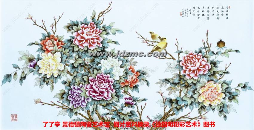 “百宝阑干护晓寒,沉香亭畔若为看。春来谁作韶华主,总领群芳是牡丹。”牡丹作为花中之王,向来是富贵荣华的象征。作者笔下的牡丹,花姿妖娆,再以黄鹂点缀其间,动静之间,画面更是生香意动。