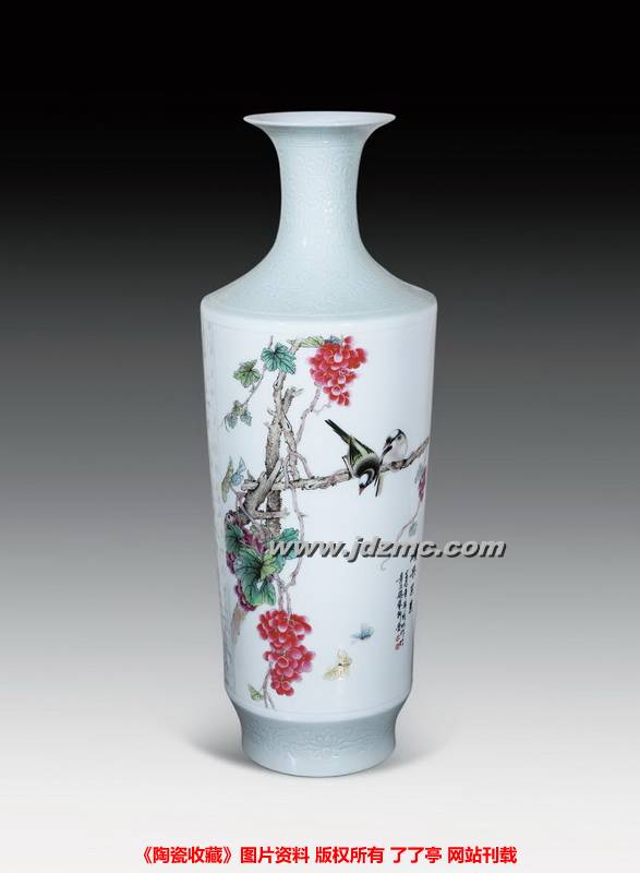 难能可贵的工笔全粉彩作品,以精谨细腻的笔法描绘景物的中国画表现方式,随类敷色,层层渲染,得以画出禽鸟活跃之态、花卉芳艳之色。通过“取神得形,以线立形,以形达意”获取神态与形体的完美统一,在造型更加准确的同时,保持了线条的自然流动和内容的诗情画意。设色明快高雅,色调统一,具浓郁的传统民族色彩审美意趣。作品象征硕果累累,兼长寿之寓意。