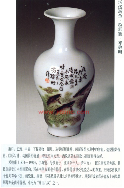 | 邓碧珊1929年粉彩春江跃鲤图 邓碧珊 20世纪20年代福建金山 邓碧珊粉彩鱼藻图笔洗鉴定图 邓碧珊鱼藻图画风辨伪 近水知鱼性邓碧珊 粉彩瓷画新技艺 近水知鱼性——回忆邓碧珊 邓碧珊小传 邓碧珊的艺术生涯 |