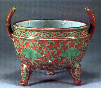 明成化(公元1465年-- 1487年)官窑红地绿彩灵芝纹三足炉 通高14厘米 1994年景德镇明御厂故址龙珠阁出土 景德镇陶瓷考古研究所藏 直颈,微鼓腹,两耳呈弧状内弯,口沿饰两道弦纹,犬形腿。内壁挂白釉。外壁饰缘彩缠枝灵芝,填矾红地。底画青花双圈双行成化款。此器双耳内卷,为明瓷炉中罕见之作,为传世品中所未见。 |