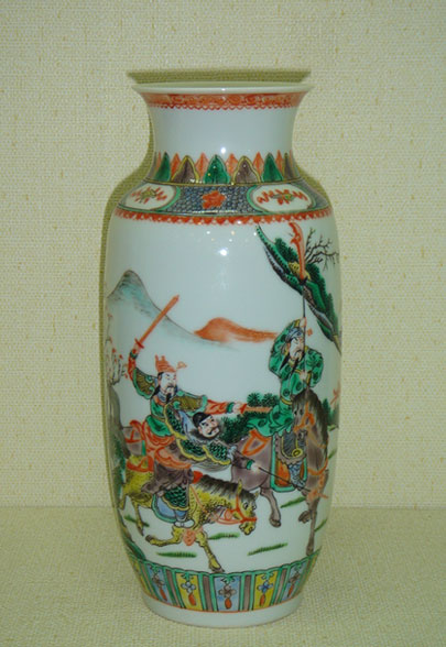 五彩《孟德刺卓》人物纹盘,取材于中国古典文学《三国演义》第四回故事中的一个情节,描绘了曹操行刺董卓时,“急挚宝刀在手,恰待要刺,不想董卓仰面看衣镜中,照见曹操在背后拔刀,急回身问;:耶孟德何为芽爷时吕布已行至阁外......”的瞬间情景。彩盘的线描均为铁线描,笔力较明代五彩更加雄健老辣。人物的衣纹流畅,转折有序,尤其是三个人物的状貌和神情表现,其形象的概括和提炼达到了不可再删增的地步。发髻须髯施用的黑彩,光亮如漆,不仅起到了提神作用,强化了绘画效果,也使人物形象更加生动突出。除矾红外,彩盘中各色都用平涂技法,色彩仍浓重的原色,加上五彩强调线的笔力,故有一种硬朗古拙的韵律。所以古籍中也称康熙五彩为“硬彩”,而在景德镇则直呼为“古彩”。