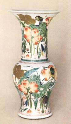 五彩描金莲池纹凤尾尊系清代康熙年间景德镇御窑厂贡瓷,敞口长颈、圆腹,胫部分内收至近底处外侈,形似凤尾,故有凤尾尊之称。通体以白釉为地,其中以红、绿、蓝、紫、黑、金等彩画鹭鸶荷塘图。绘画采用了写实的手法,表现了夏季“接天莲《无穷碧,映日荷花别样红”的天然之趣,其间那“翮翮飞振振”的鹭鸶,那“点水款款飞”的蜻蜓,那“红襟翠翰两参差、轻拂烟花上细枝”的翠鸣,无不刻画得栩栩如生。由于五彩的彩绘方法是单线平涂,敷色微微凸起,较为厚实。烧成温度也较粉彩略高,色彩给人以古拙刚硬之感,景德镇称其为古彩。此尊画风有明末陈洪绶遗韵,花鸟形象夸张,富有装饰意味,兼之胎质细腻,色彩华丽,为五彩瓷中珍宝。现藏于北京故宫博物:。