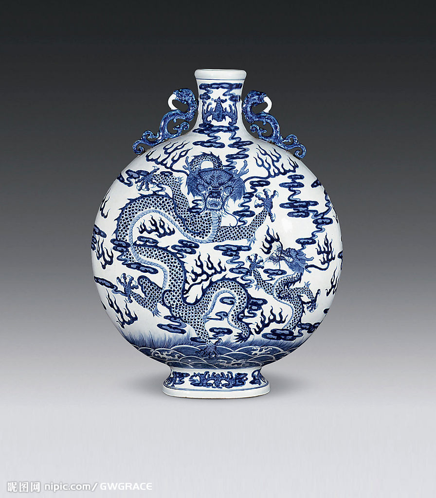乾隆青花葫芦扁瓶以青花红彩为饰,青花绘海水纹,红彩绘龙纹、藏传佛教吉祥图案八宝纹中的宝伞纹、金鱼纹。汹涌澎湃的海水,红彩蛟龙闹海,飞腾其间,勇猛矫健,有叱咤风云之势。器辅以青花绘缠枝花卉纹、回纹等。外底青花书“大清乾隆年制”六字三行篆书款。此瓶造型仿自西亚阿拉伯铜器,又称为“抱月瓶”或“宝月瓶”。明代洪武时期御窑厂开始烧制此器物,有青花器。永乐宣德时期有青花与白釉品种。清代康熙、雍正、乾隆时有仿烧,改称“马挂瓶”,为皇亲国戚骑马出行时随身携带的用具。 |