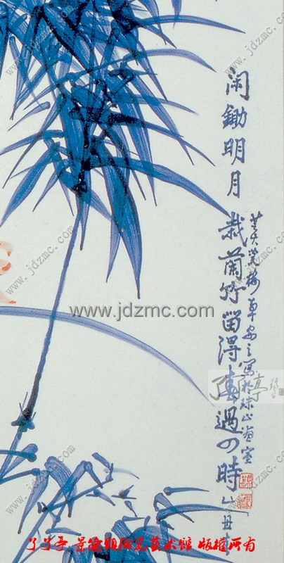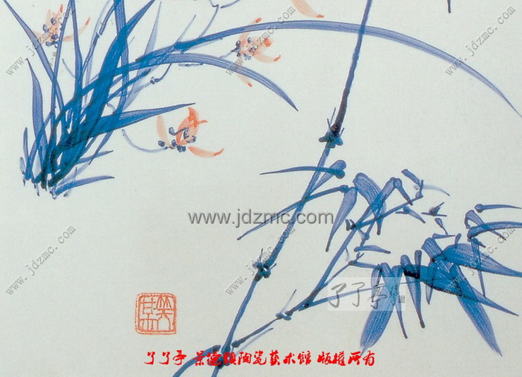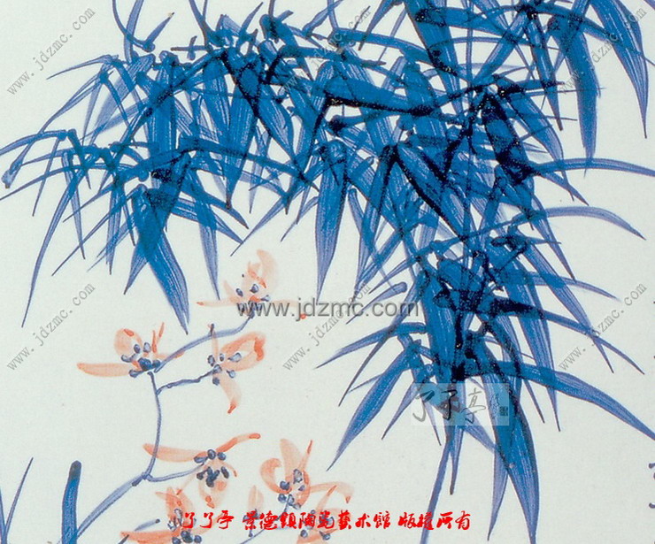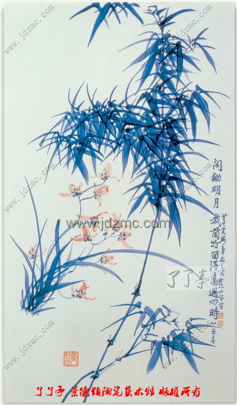 画上青翠挺劲的秀竹有迎风之势,笔法遒劲有韵,潇洒而不狂乱。兰花秀逸疏朗,呈色淡红润雅,呈现一派欣欣向荣的景象。左下靠近竹竿处钤“笑某”印章,使青花瓷画更有生气,加重了文人画的品位。