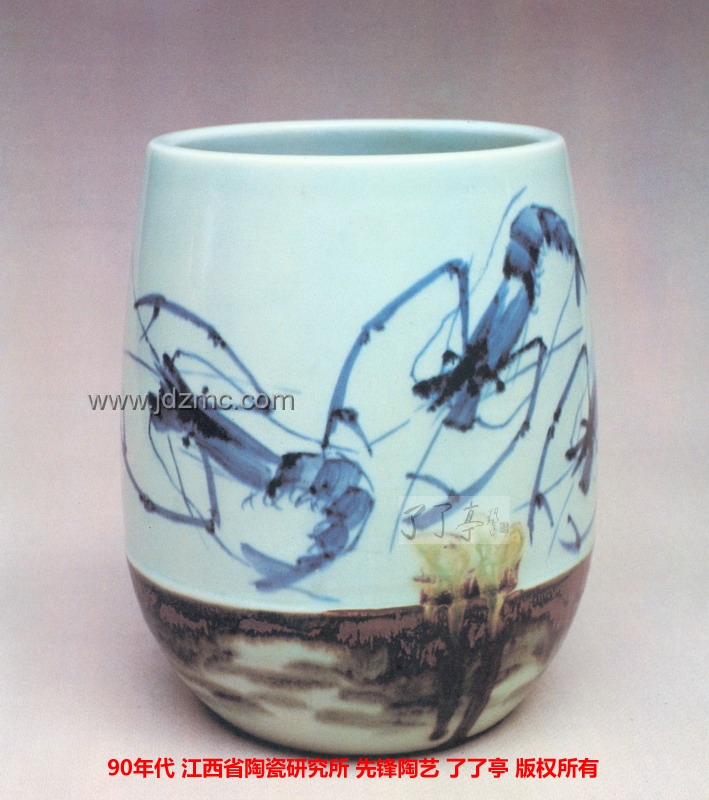 90年代 省所先锋陶艺《虾》青花白瓜瓶 黄杨