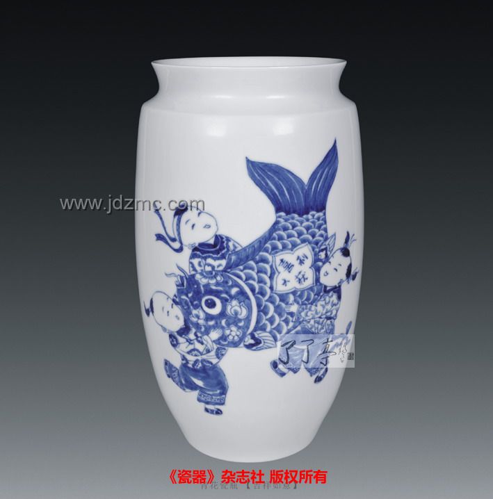 高:43cm口径:21cm瓷瓶《吉祥如意》 作者:刘清云(江西省工艺美术大师) 《吉祥如意》作者:刘清云 三个招财童子合力抬起一条大鲤鱼,预示着来年风调雨顺、吉祥如意。廖廖几笔青花料,就将童子的喜悦心情展露无遗。