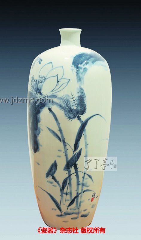 青花瓷瓶《大和谐》 作者:袁乐辉 高:58.7cm口径:7cm 《大和谐》作者:袁乐辉 袁乐辉,1978年出生,现为景德镇陶瓷学院陶瓷美术学院讲师。作品《大和谐》借用“荷花”谐音为“和谐幸福”寓意象征,以中国小写意画手法,结合景德镇青花绘画材质,来描绘出夏日绽放的荷花形态,表达荷花的生命圣洁、旺盛、顽强,寓意我们社会和谐发展、和睦共处、幸福美满。