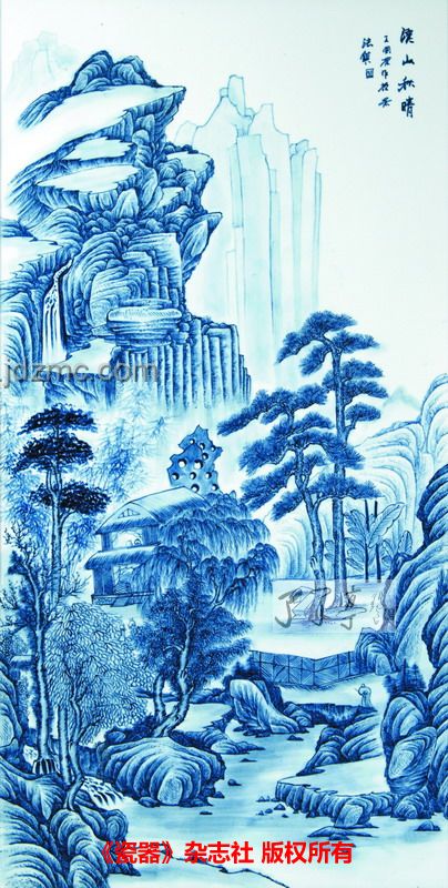 青花瓷板《溪山秋晴》 作者:王国荣 112cm×56 cm 青花瓷瓶《溪山秋晴》 作者:王国荣 高:45cm口径:17cm 《长城红》《溪山秋晴》瓷板《溪山秋晴》瓷瓶作者:王国荣 王国荣,1976年生,江西乐平人,擅长国画、陶瓷雕刻综合装饰。其作品厚重,有质感,体块感强,具有浓厚的民间传统装饰性。