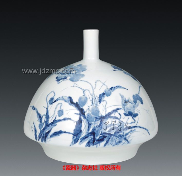 青花瓷瓶《美人醉蝶》 作者:仝志辉 高:32cm口径:4cm 《美人醉蝶》作者:仝志辉 仝志辉,字了然,了然居主人,品雅轩主人,高级工艺美术师。其作品色彩明快,雅致清新。