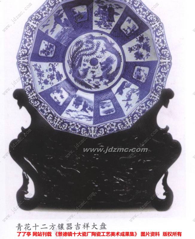 人民瓷厂青花十二方镶器吉祥大盘是1991 年试制成功的特艺传世之作,主要研发人员是刘升辉(负责花面设计,现为景德镇高专艺术系主任、教授,中国陶瓷艺术大师)、吴长林(负责模具造型和制作,现为高级技师)。该产品口径达86厘米,是盘类大型镶器产品,在成型尤其是烧炼时极易产生变型,裂口的缺陷。创制人员通过反复试验,根据窑温调整了泥釉比例,重点研试了镶器连接部位的泥釉配方,保证了该产品的烧制成功,这是陶瓷盘类大型镶器产品的首创。该盘造型与装饰古朴大方,装饰形式与造型相吻合,采用龙凤呈祥、飘带缠绕八宝的图案,辅之以人物、山水、花鸟,构图线条凝练,龙凤栩栩如生,景物布局合理,画面浑然一体,整个作品具有独特的风韵,给人以浓厚朴实的青花美感。该盘1993年荣获景德镇市科技进步奖。