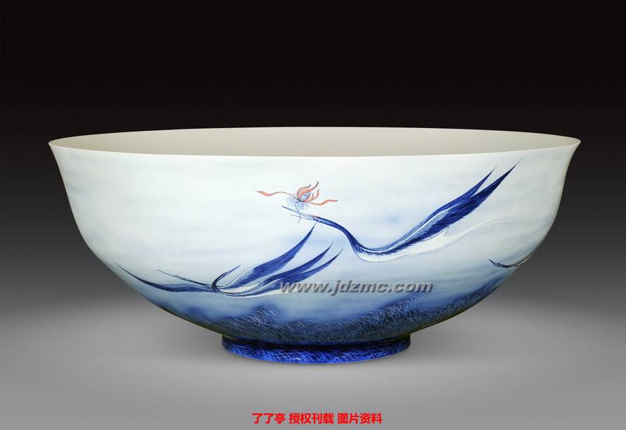 江西省工艺美术大师马俊“青花分水半刀泥芦苇” 釉下青花薄胎莲子碗《心香清音》作品赏析:江西省工艺美术大师马俊耗时多年创作出了直径125.5厘米、高49厘米、最薄处不足2毫米的釉下青花薄胎莲子碗《心香清音》。马俊是在薄如蝉翼的泥坯上采用勾勒方法手绘出翩翩舞动的仙鹤,采用青花分水半刀泥的手法刻画出芦苇,经过1300多度的高温烧制而成。整个釉下青花薄胎莲子碗洁白无瑕,薄如蝉翼,在阳光或是灯光的照射下剔透玲珑,从碗的背面就可以清楚地看到正面的青花纹饰,在摇曳生姿的芦苇衬托下一只仙鹤在幽静的空中口衔莲花呼朋引伴,画面下一对仙鹤顾盼呼应、而小舟上却没有人,只有船上的瑶琴和徐徐升起的清烟。似乎想告诉我们——画中有人心香清音,画外有人心静清逸,更添“此处无声胜有声”的意境之美。也表现了 “莲开见佛心”的美好寓意。“一个人如果心如莲花,纵使在红尘飞扬的世间,也不失去庄严、曼妙的心情”。《心香清音》与林清玄的《处处莲花开》不谋而合,都教人永远保持内心清明的莲花。