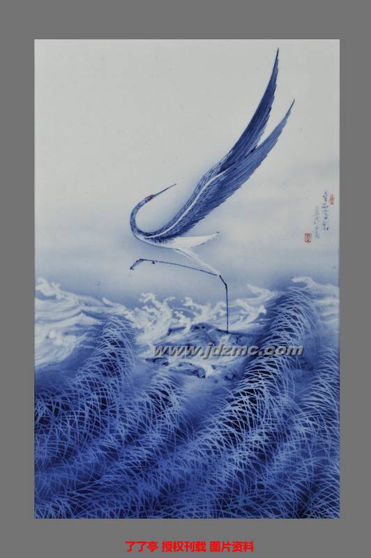一品,为古代官员之最高等级。鹤性清高,为羽族之长地位仅次于"凤",借喻人臣之极。被喻为一品鸟在古代为一品官员寓意纹样,故用鹤以表一品。“潮”与“朝”谐音,仙鹤当潮水而挺立,寓意“一品当朝”,表示官位极高,主持朝政。江西省工艺美术大师马俊作品《一品当朝》就采用了娴熟的青花分水半刀泥技法将鹤的傲然挺立与芦苇林的繁茂和自由描绘出来,画面明暗关系的处理和意境的把握都十分到位,使这样一件用色极简的作品呈现出丰富的内容。线条随意奔放,时而用枯笔皴擦,时而用淡墨泼洒,可谓变化万千。马俊最擅长的是用浓淡不同的墨线,反复勾画润染,使画面层次丰富、意境深远,初看似乎苍茫一片,细看越觉得意趣无限。鹤在中国传统文化中跟人的精神品格有着密切的联系,古人多用白鹤比喻具有高尚品德的贤达之士,把修身洁行的人称为“鹤鸣之士”。马俊正是被鹤高洁的品性所感染,他将这种情感赋予他的作品中,这件《一品当朝》就是难得的佳作。