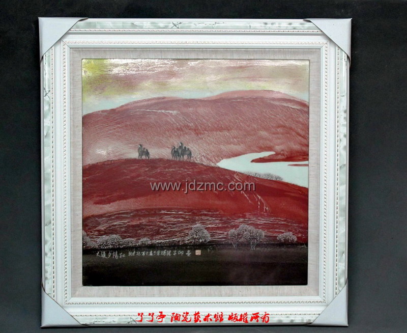 徐子印老师这件作品以瓷板为载体,这也正是徐大师的特色的优质作品。笔者为友人挑选出了两件极为代表性的画面,一春景一大漠风光。流彩的美需以平面为载体才能发挥出最好的效果,瓷板因而首选代表性的表现形式。作品瓷板釉质细润光洁,画面以春色山水、大漠浑然为题材,巧妙运用新彩色料变化丰富之长,参以西画画法,泼墨泼彩,酣畅淋漓,无意求工而妙趣天成,作品达到山与水连、人与景合、春来青溪更悠长的诗境。了了亭·李申盛/文